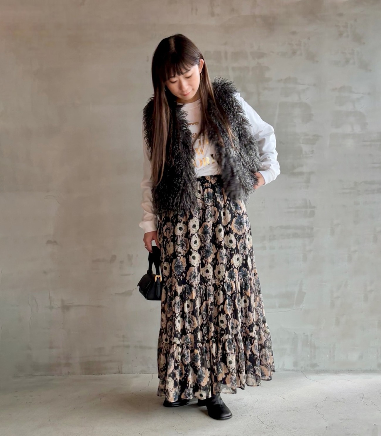 スカートはフランスのDEVEAUX社のプリント生地を使用したギャザースカートで、ウエストがゴム仕様なので履き心地抜群。