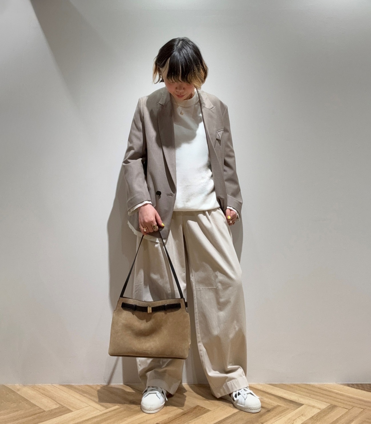 メンズライクな装いは、柔らかい色合わせで親しみやすく仕上げたいです。ジャケットやはっきりとした白のニットでクールなイメージですが、全体的にふんわりとした色合わせや程良くゆったりとしたライン選びで、かっこよさと親しみやすさのバランスをとると良さそうです。