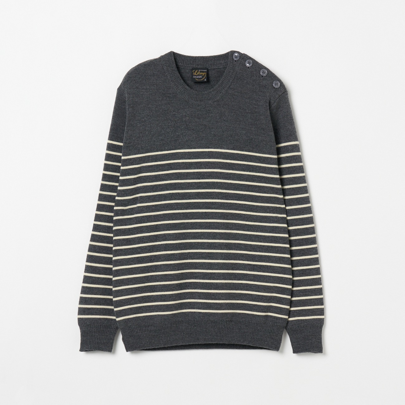 フレンチ メリノウール100%のルトロワのマリンボーダーニットです。フレンチマリンボーダーニットの定番と言えるベーシックなスタイルで、しっかりとした厚みのある編地のニットです。サイドのショルダーラインには開閉可能なボタンがついていてデザインのポイントになっています。ネイビーxオフホワイト、グレーxオフホワイトの2色展開です。