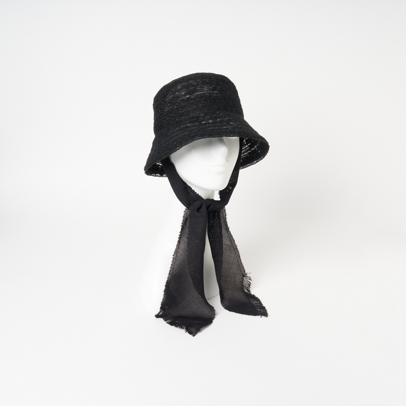 繊細なデッドストックのラッセル編みブレードを使用し、ナチュラルで上品なムードを演出。スカーフは柔らかくシワになりにくいリネンライクのドライファブリックで肌あたりが良い。スカーフは両サイドのループに通しているため、お手持ちのスカーフに簡単に付け替え可能。