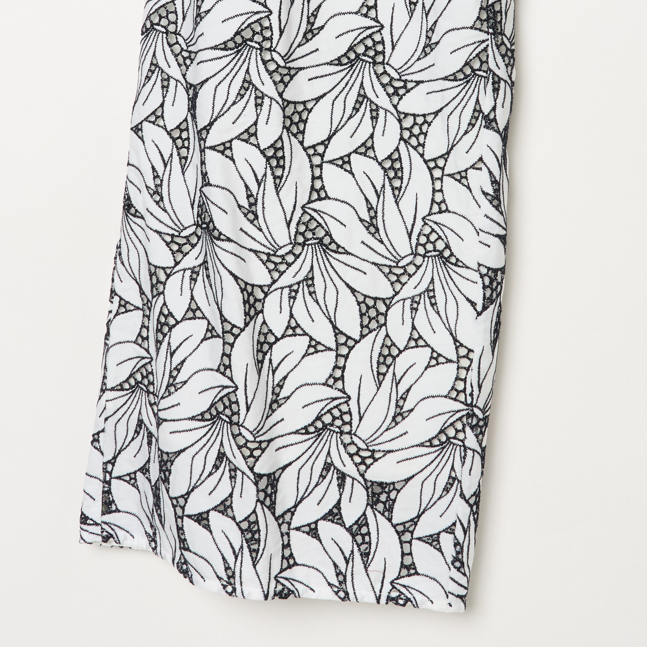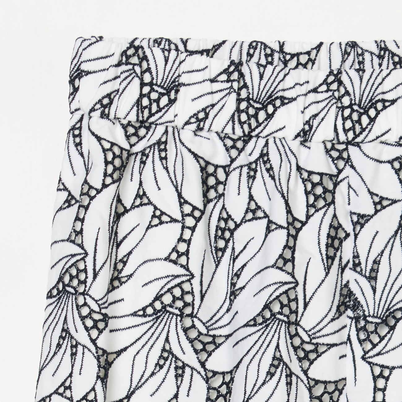 国内の産地にて生地に直接刺繍とカッティングの加工を施しているオリジナルのエンブロイダリーレースを贅沢に使用したパンツ。