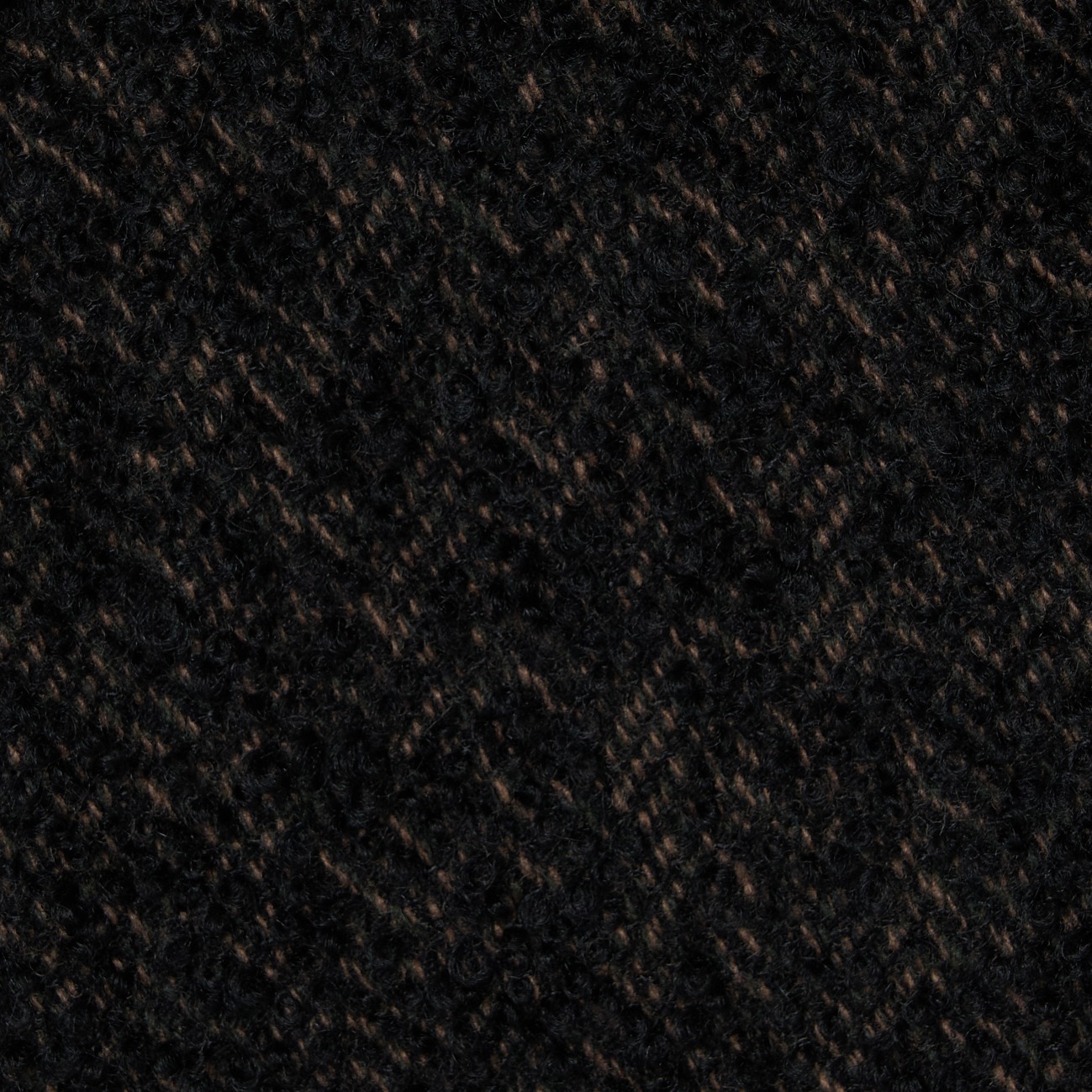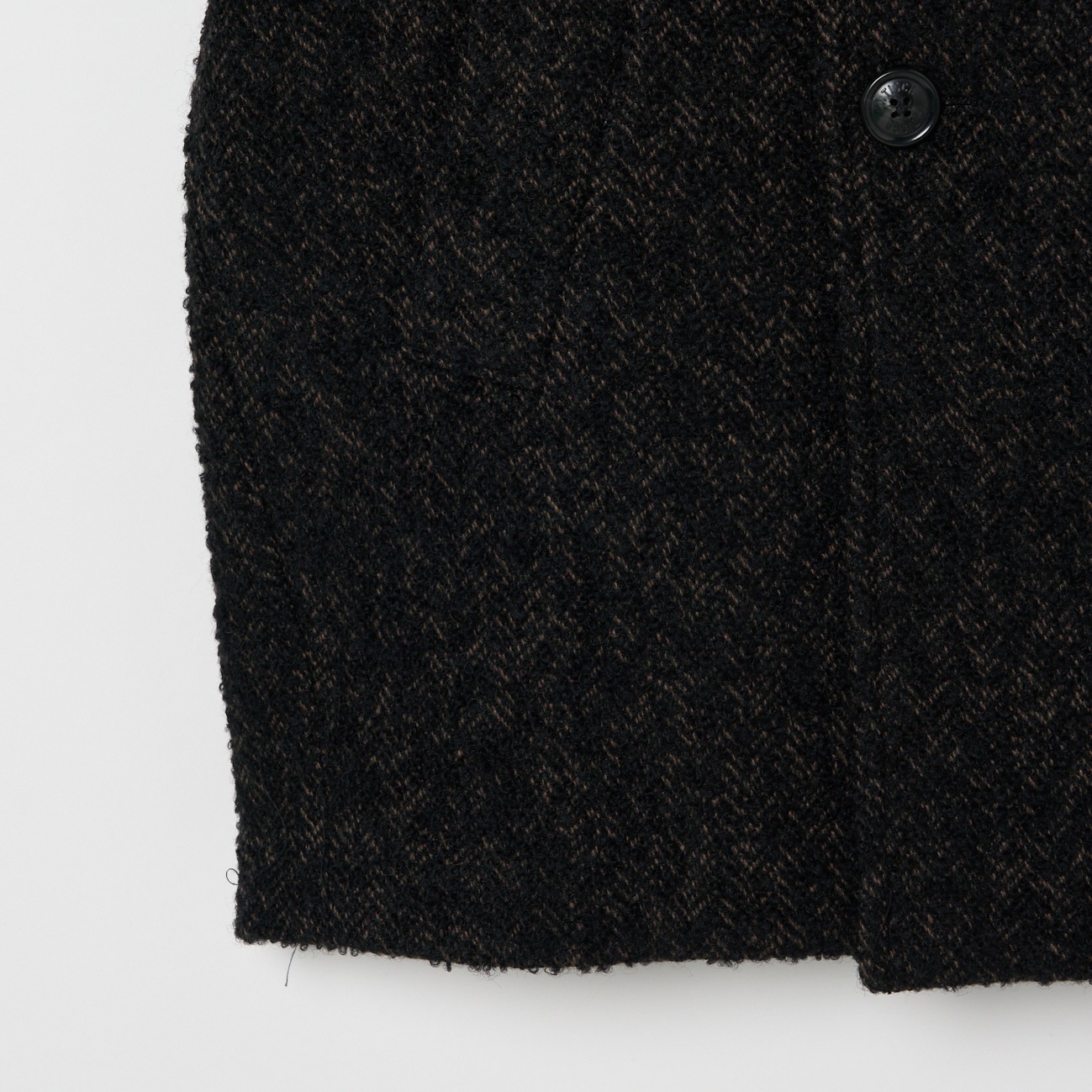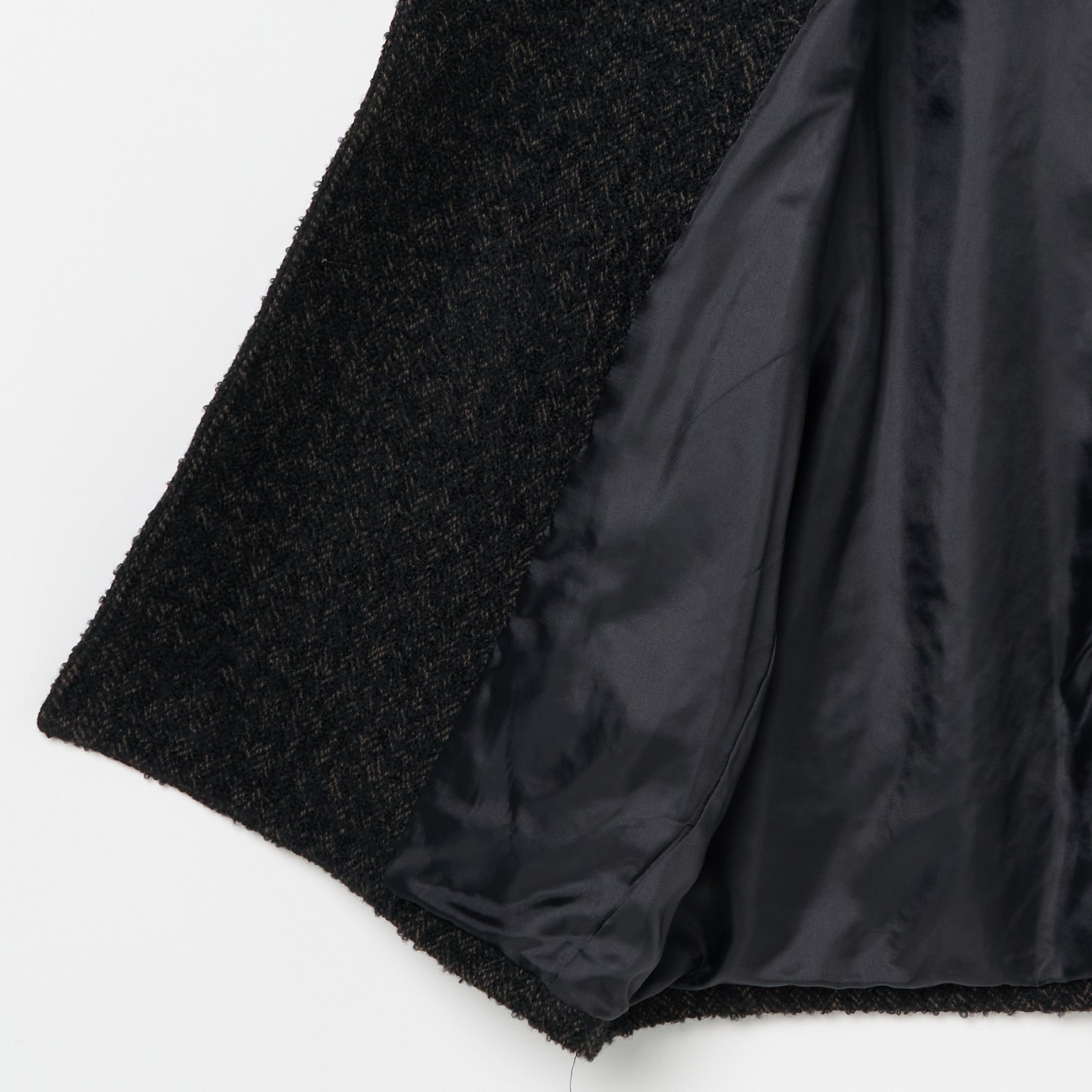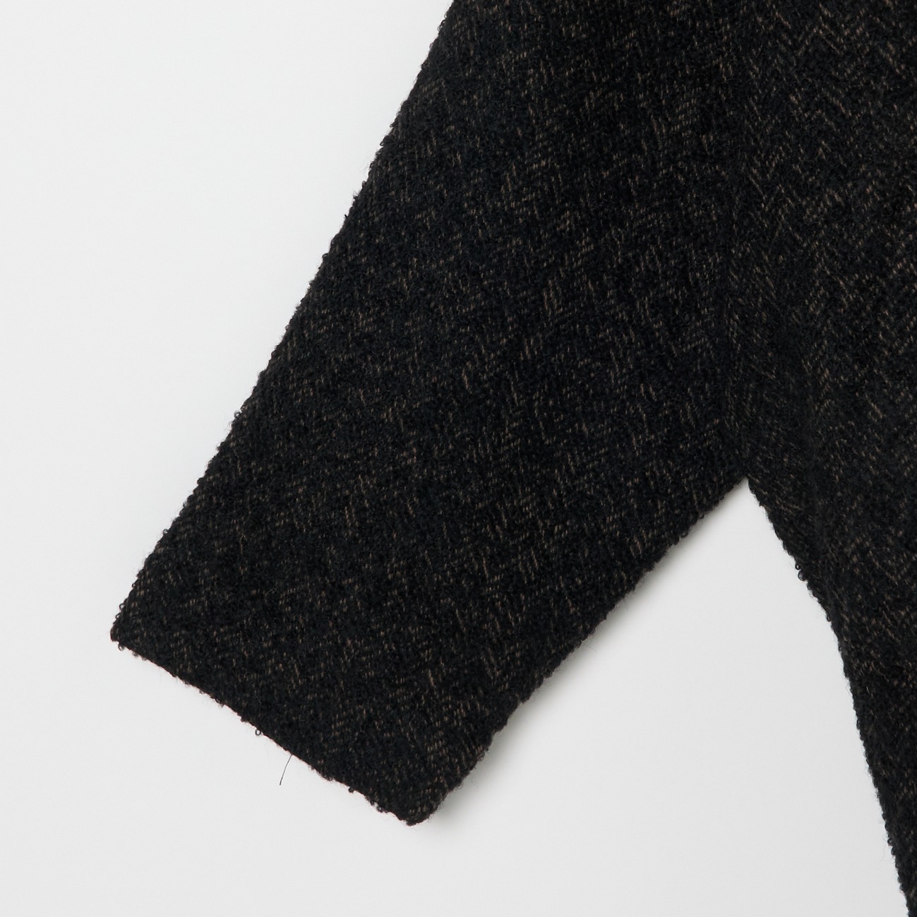 色と形状の違う糸を何色も組み合わせてヘリンボーン組織に織り上げた素材です。ウールリング糸の凸凹感のあるタッチが豊かな膨らみを生み出し、タテ糸の三つ杢が効いたテクニカルなツイード素材で何とも言えない奥行きのある深い表情が魅力の素材。