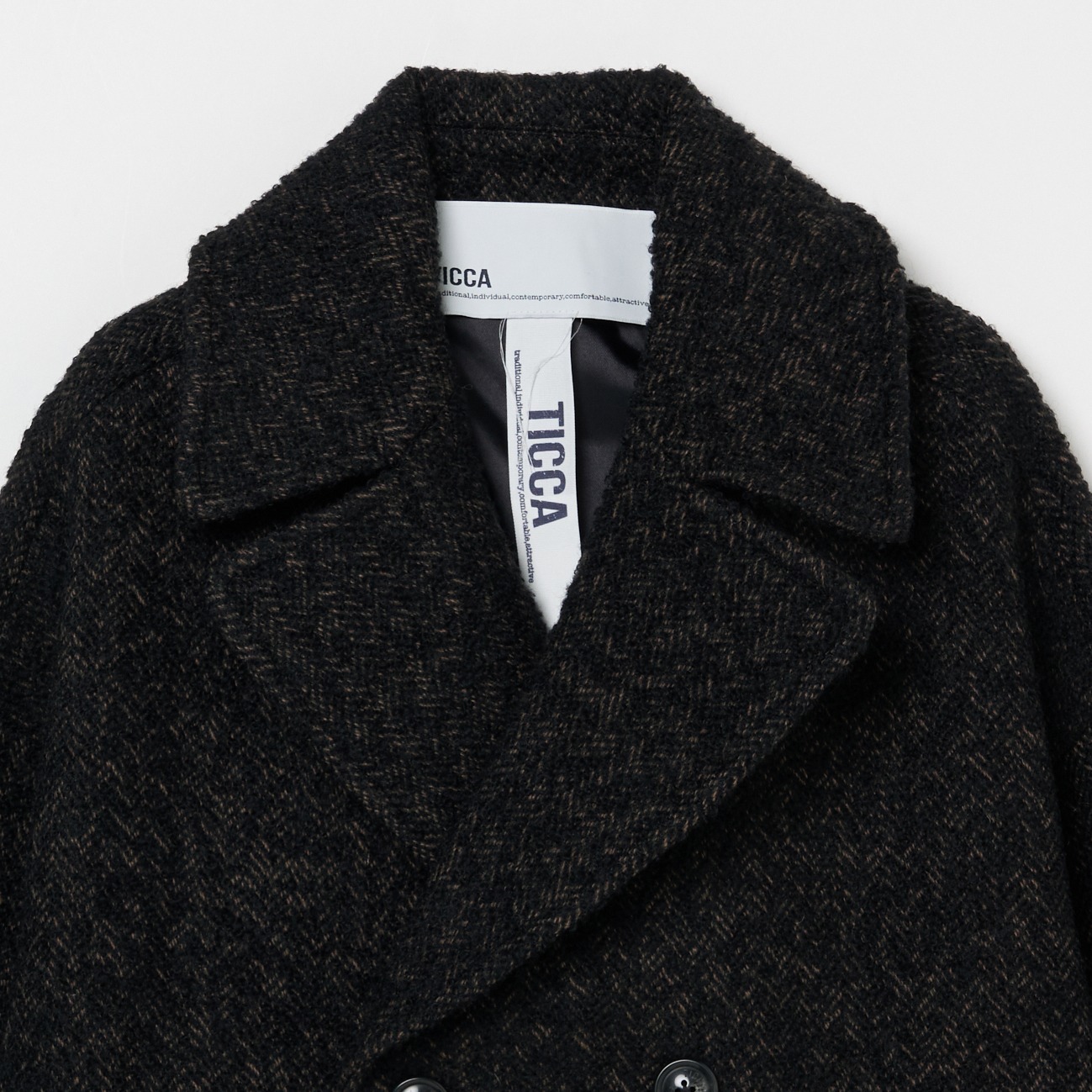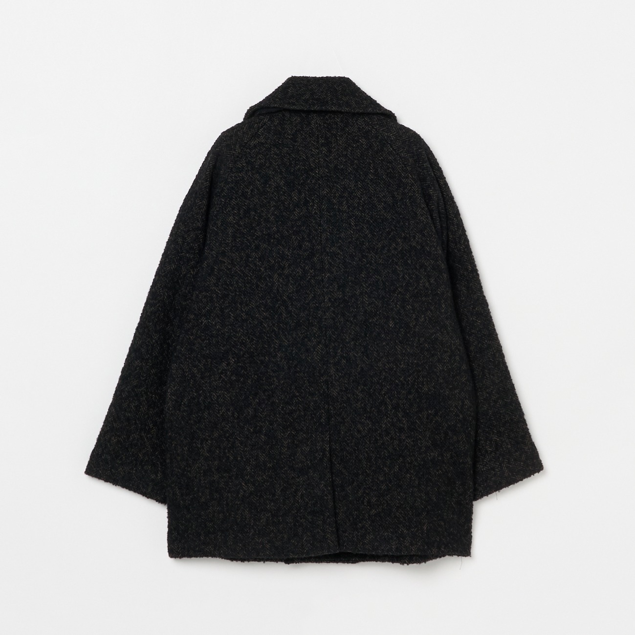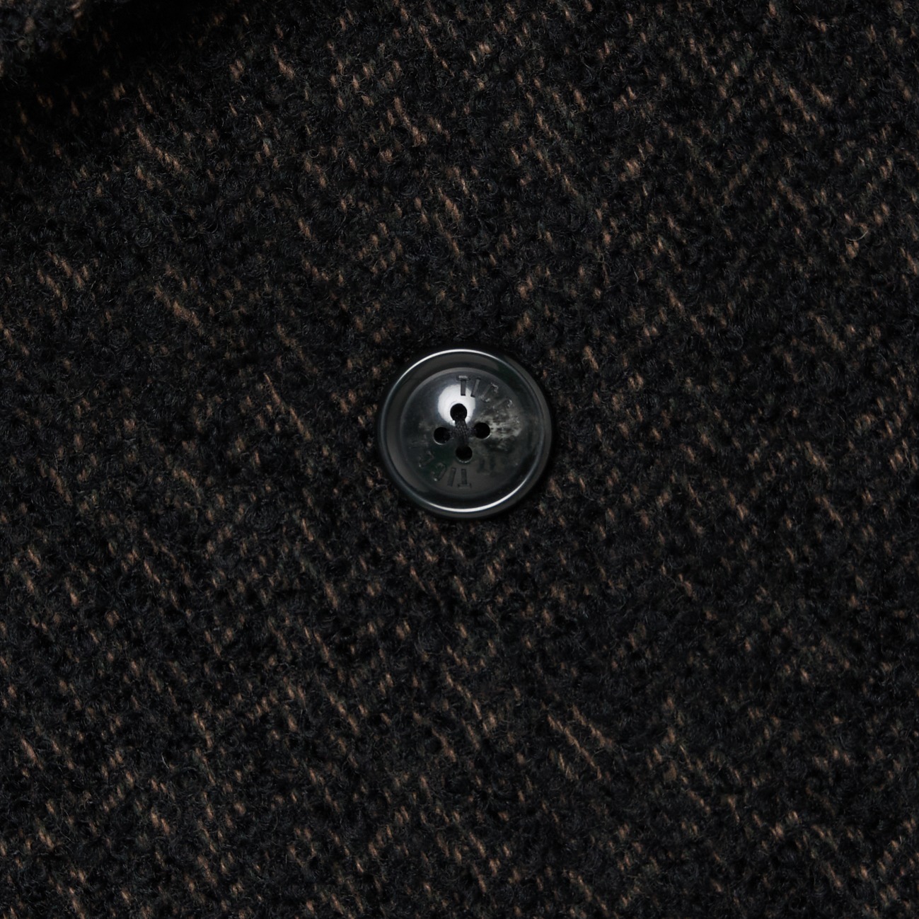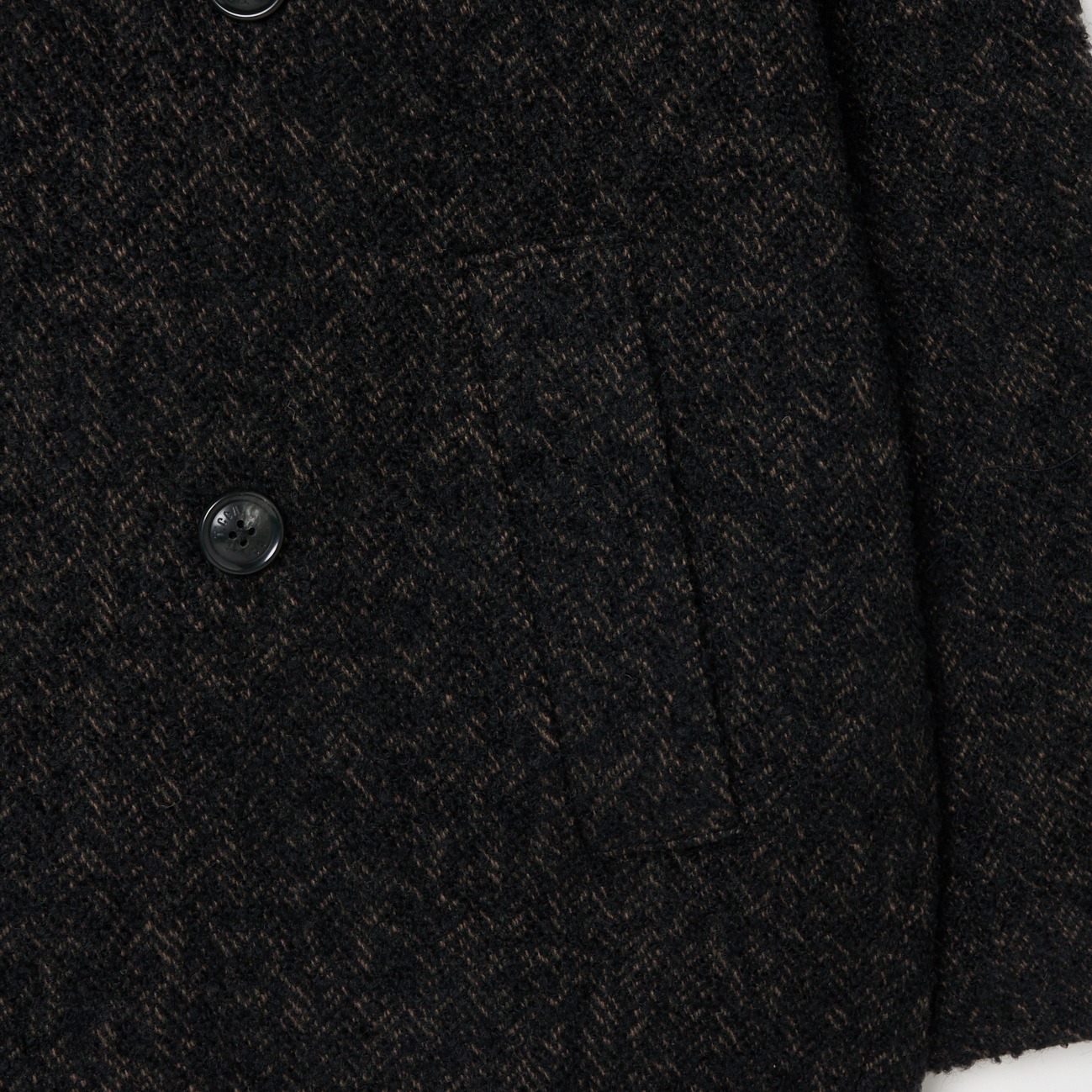色と形状の違う糸を何色も組み合わせてヘリンボーン組織に織り上げた素材です。ウールリング糸の凸凹感のあるタッチが豊かな膨らみを生み出し、タテ糸の三つ杢が効いたテクニカルなツイード素材で何とも言えない奥行きのある深い表情が魅力の素材。