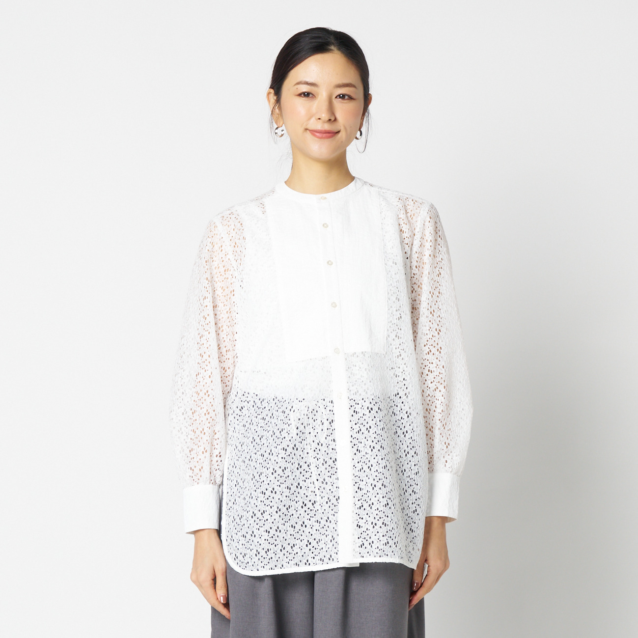 繊細なレースをベースに、バンドカラー・前立て・カフスにはあえてナイロン素材を掛け合わせています。ドレスシャツのような端正なディテールを取り入れることで、カジュアルな中にもキチン感とフェミニンなイメージを併せ持ったデザインです。