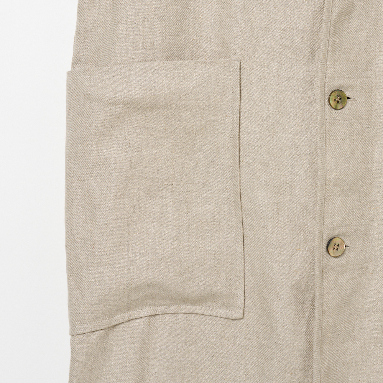 表面は毛羽立ちが少なく、クリアで上品な印象。ラフすぎないリネン素材でサラリと清涼感があり、ゆったりとしたサイズ感がと大きなパッチポケットがアクセントに。