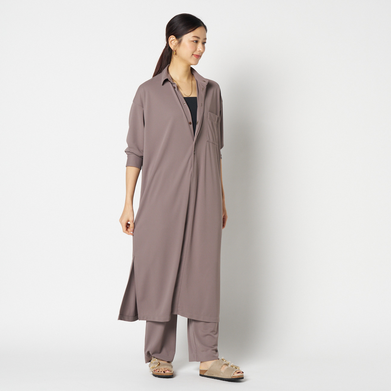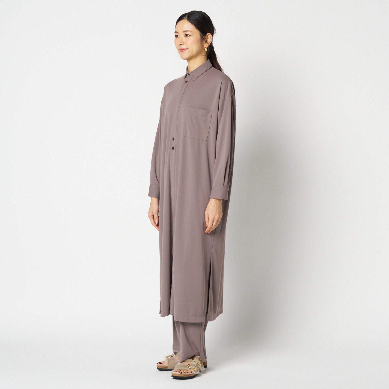 程よく肉感のある生地は、シワになりにくく、季節を問わず通年で活躍。ボタンを閉じてワンピースとして着るだけでなく、ボトムスとのレイヤードや、軽やかな羽織りとしても。