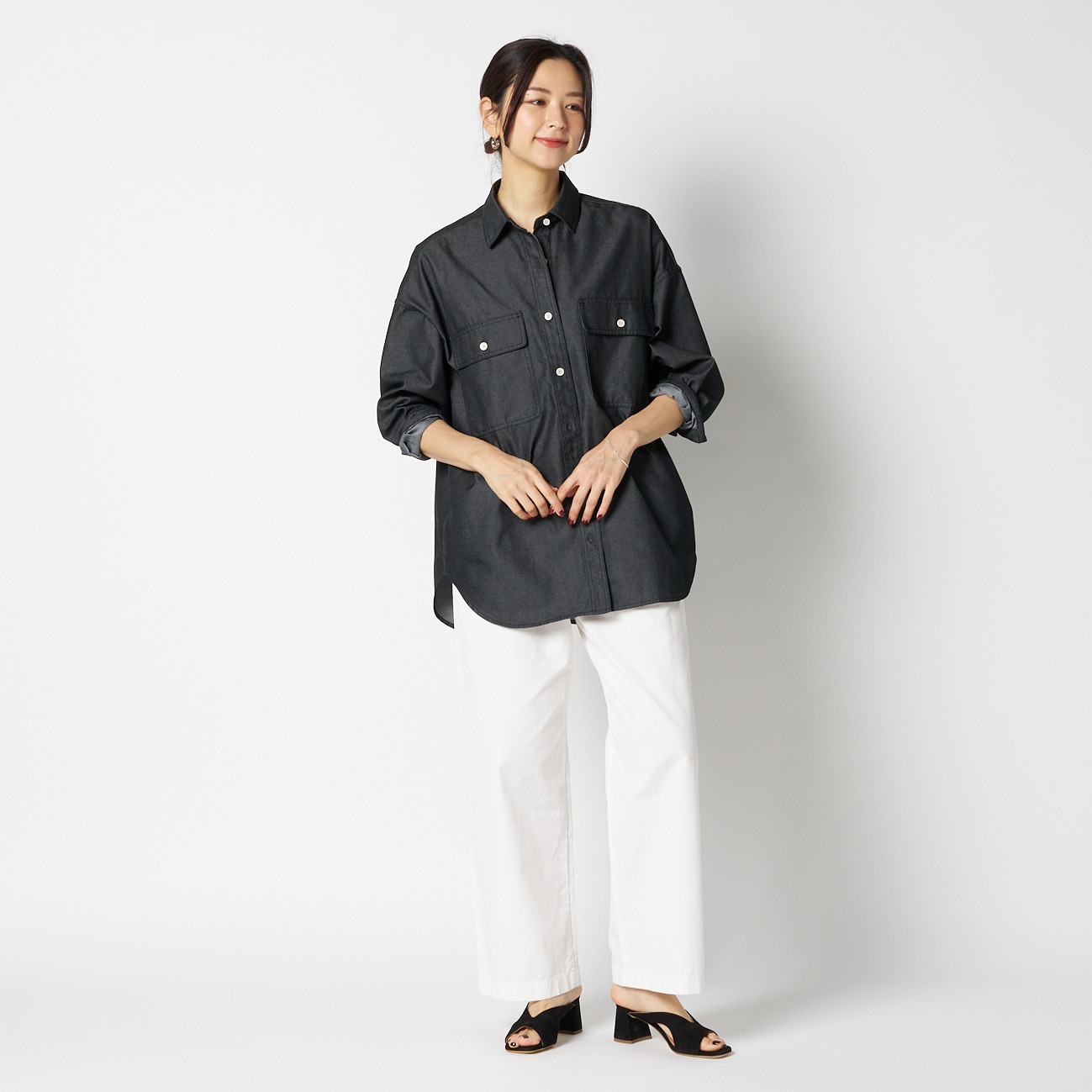 ゆったりとしたオーバーサイズシルエットに、大きな胸ポケットがアクセント。肩のラインを落としたデザインが、リラックスした雰囲気と現代的なバランスを生んでいます。