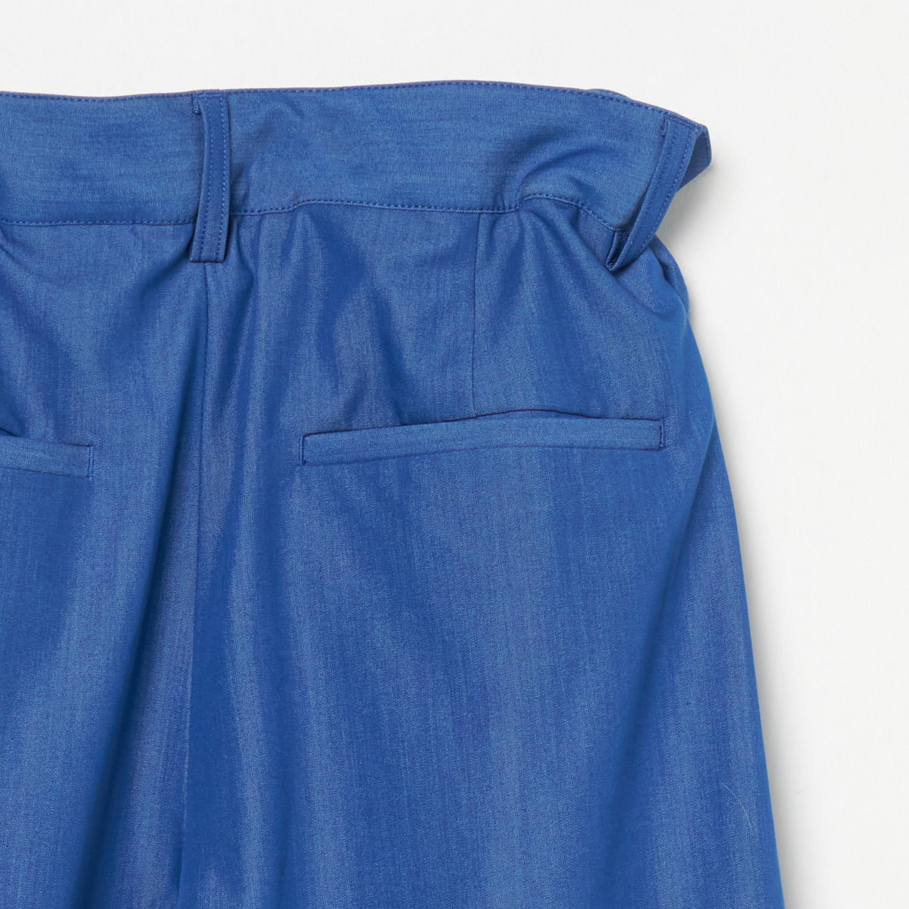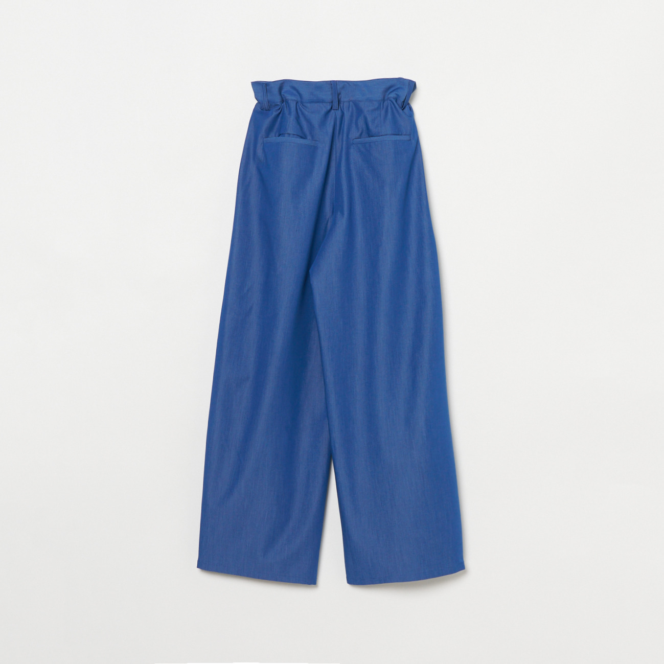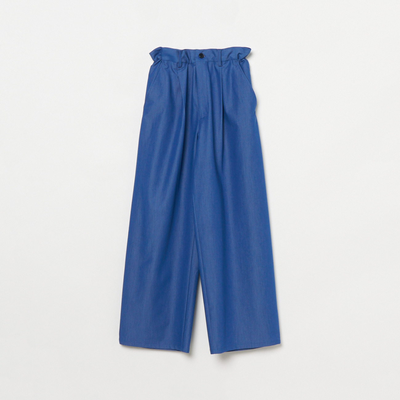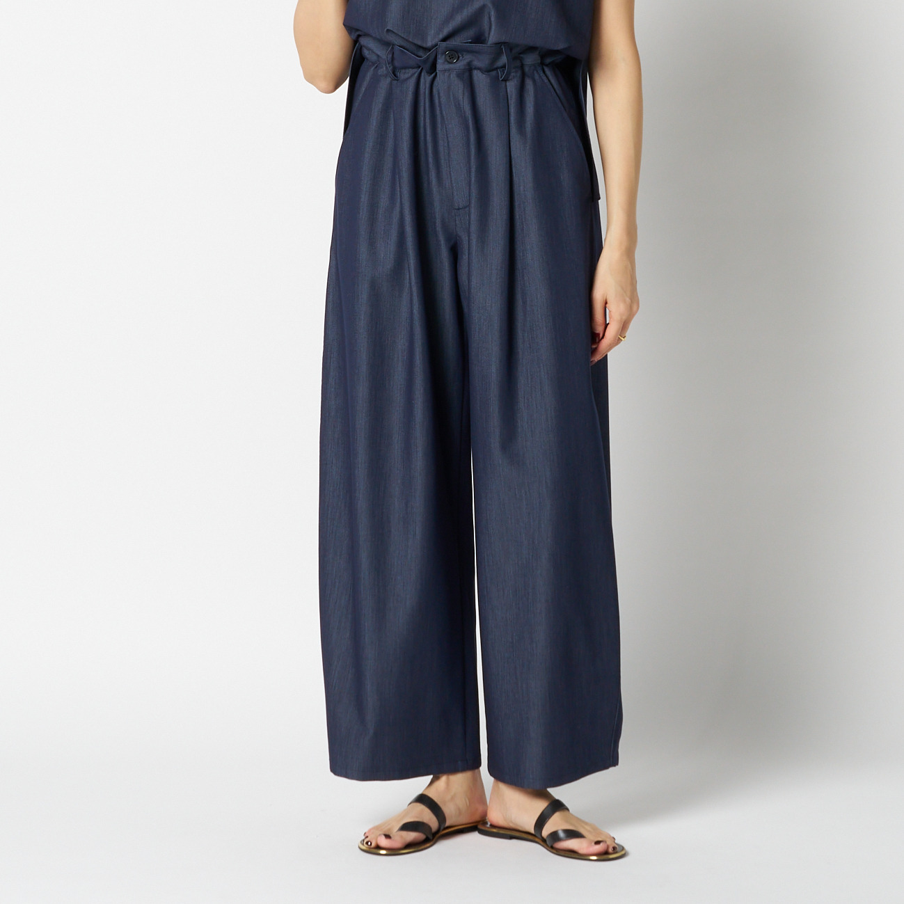 すとんと落ちるようなストレートシルエットが美しく、脚のラインを拾わずすっきりとした印象です。ウエストはリラックス感のあるゴム仕様で、フリルのような見え方がデザインのアクセントになっています。