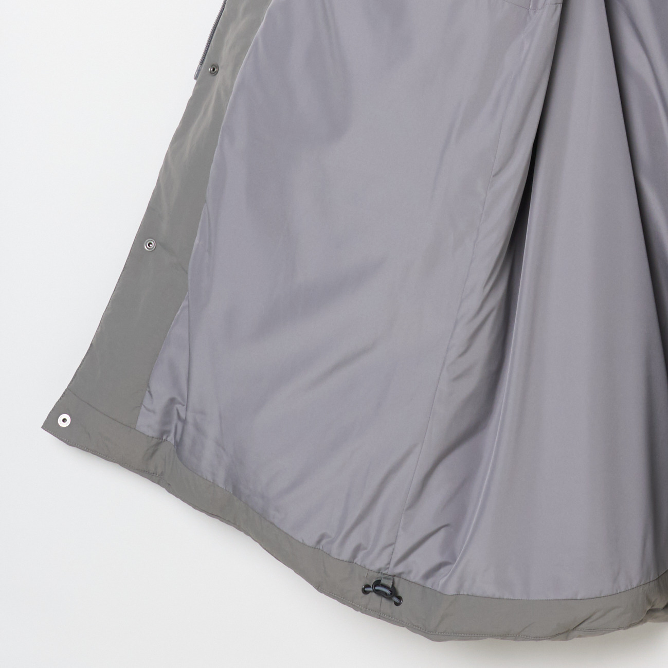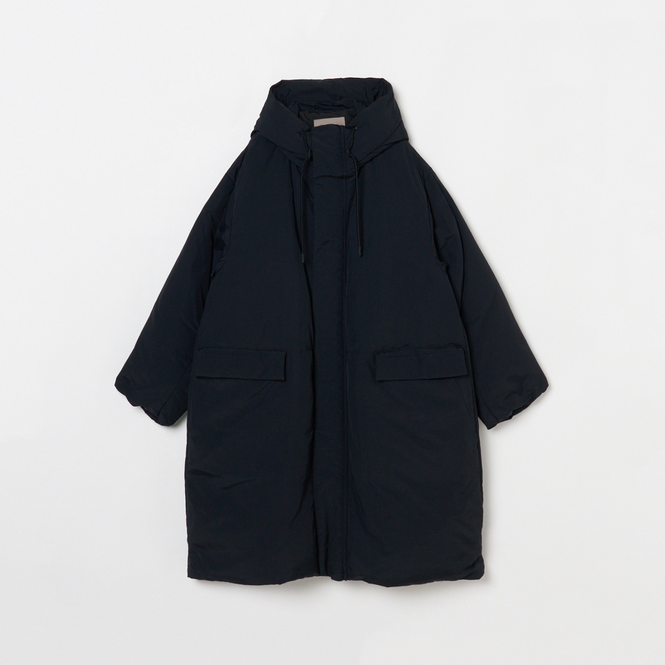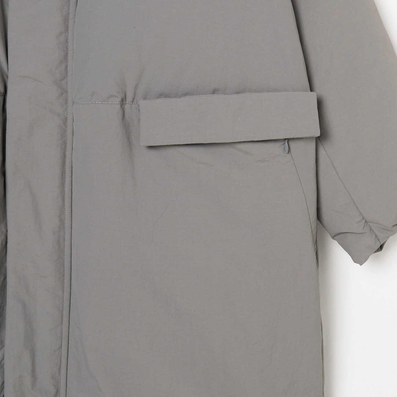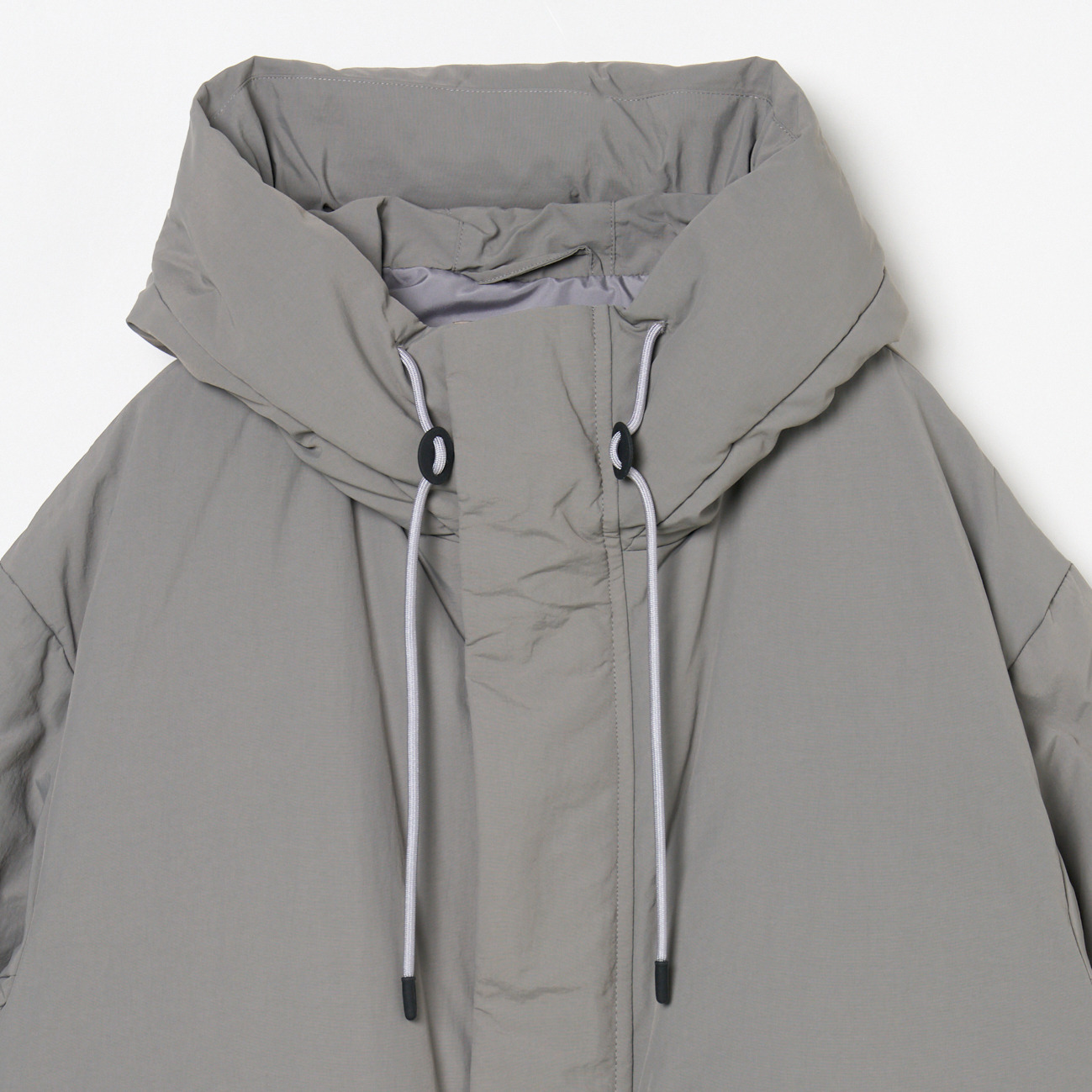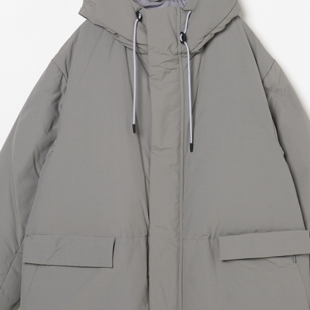 リサイクル原料から再生されたナイロンを使ったサスティナブルファブリックを使用したロングダウンフーディです。