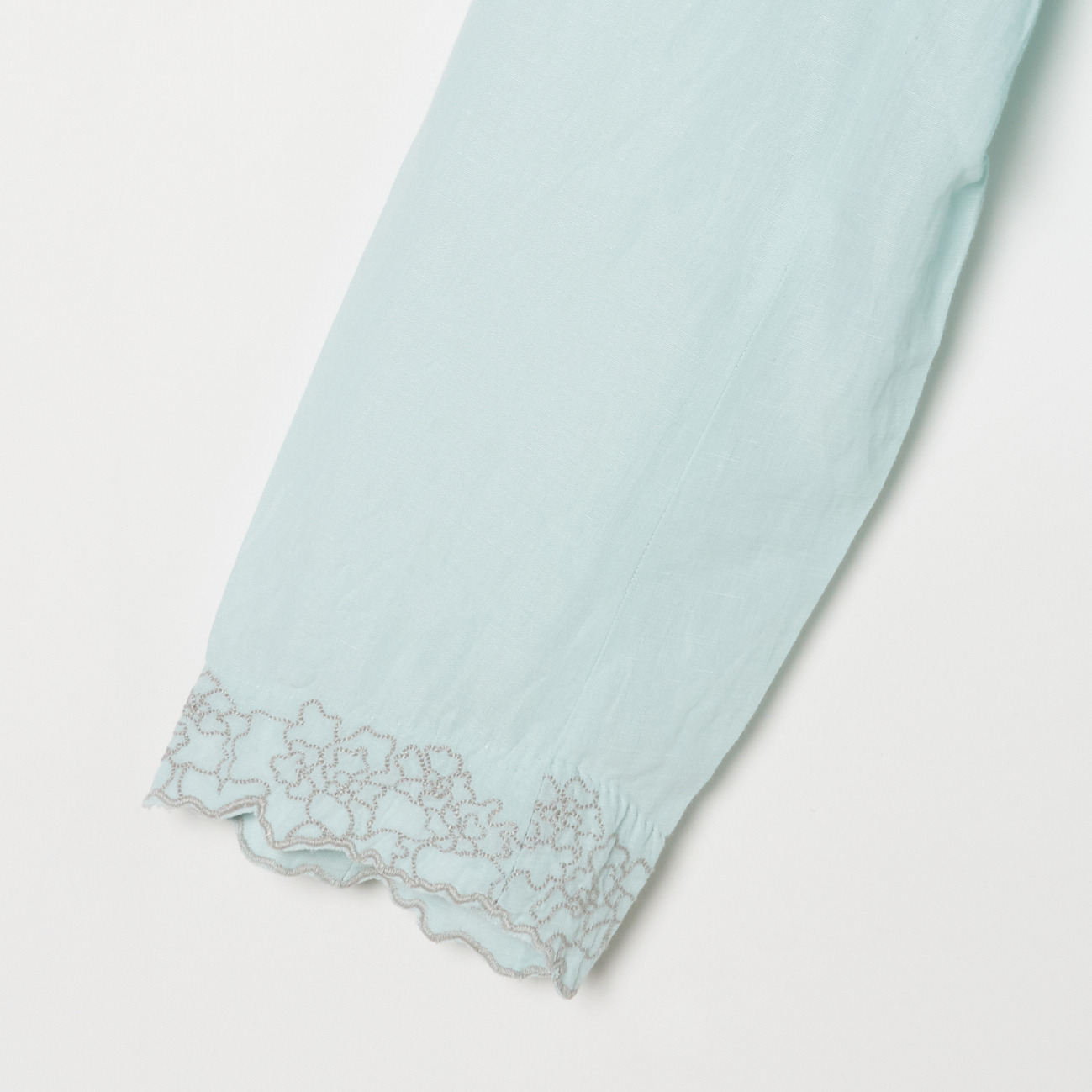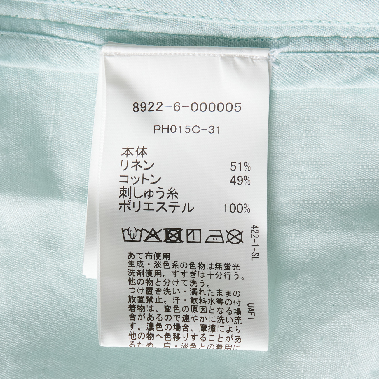 ① 総丈 服の上端から裾までの最長の直線を計測 ② 身幅 両袖の付け根下(脇の下)の横幅を計測し、2倍にした数値 ③ ウエスト ウエストの横幅を計測し、2倍にした数値 ④ ヒップ ウエストから15cm下の横幅を計測し、2倍にした数値 ⑤ もも周り ももの横幅を計測し、2倍にした数値 ⑥ 裾周り 裾の横幅を計測し、2倍にした数値 |