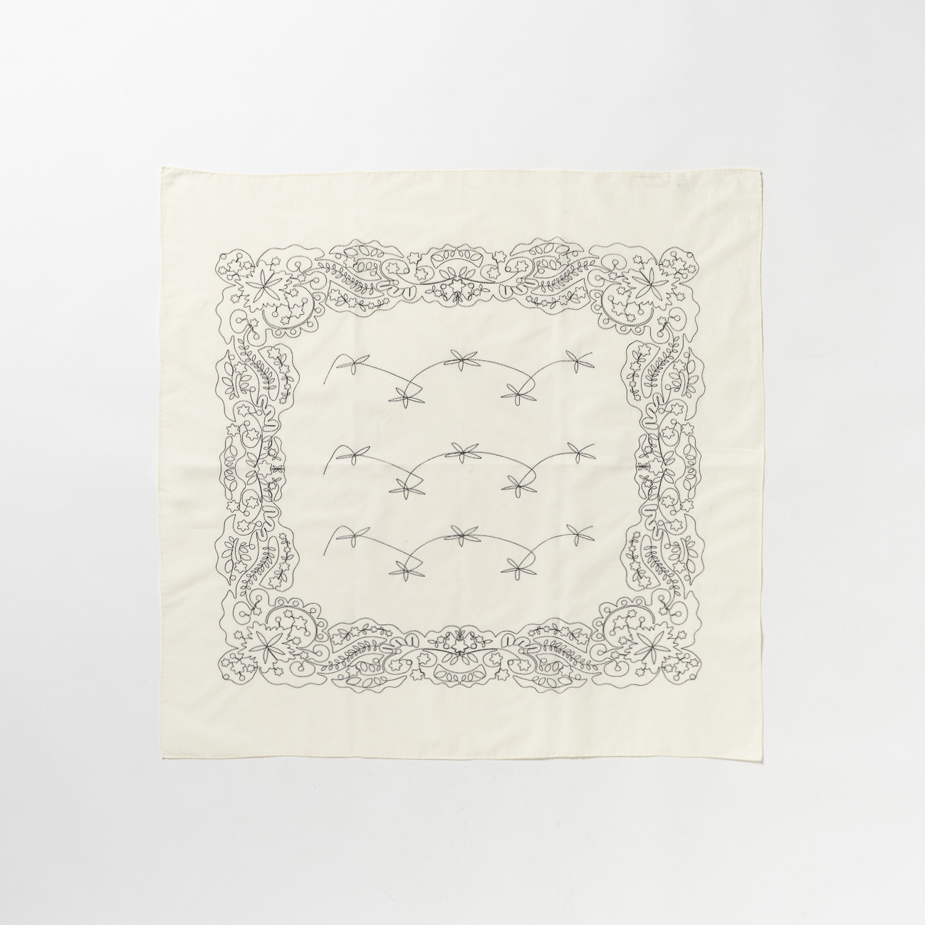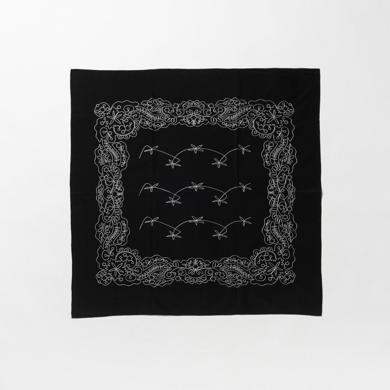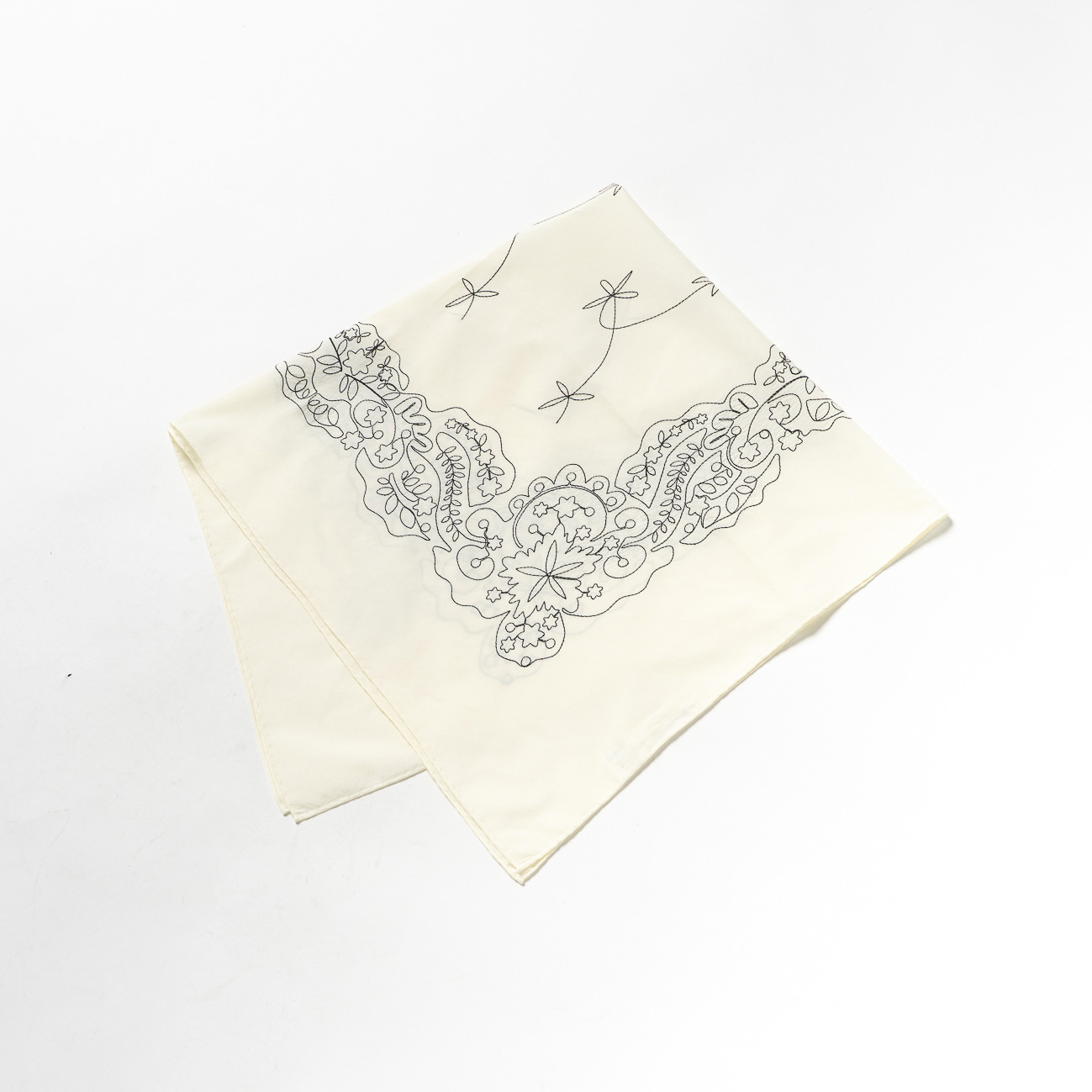 ヴィンテージバンダナの魅力を、超長綿とフィラメントシルクの上質な交織素材に、大柄のステッチ刺繍で表現した大判バンダナ。