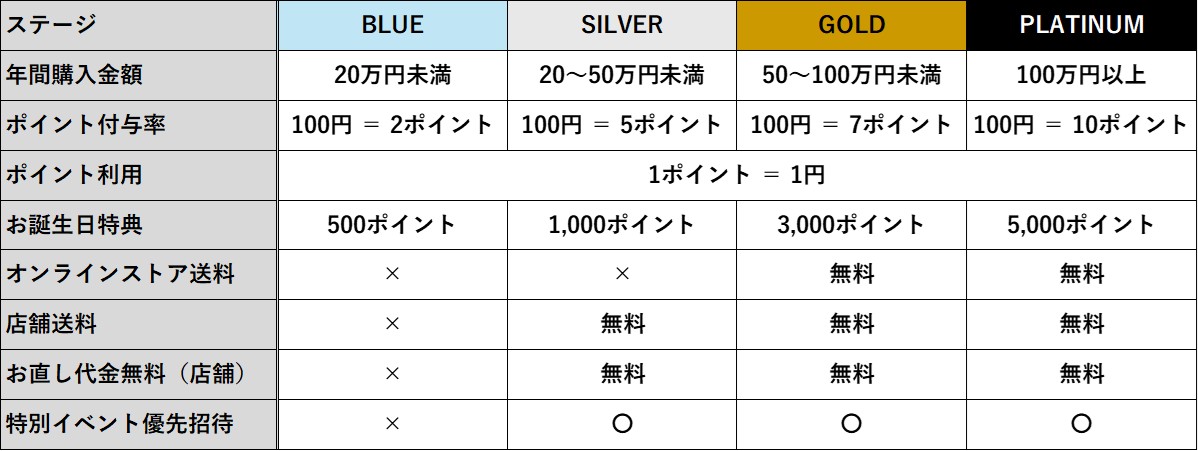 年間購入金額に対して「ブルー」「シルバー」「ゴールド」「プラチナ」それぞれの会員ステージが設定されます。
